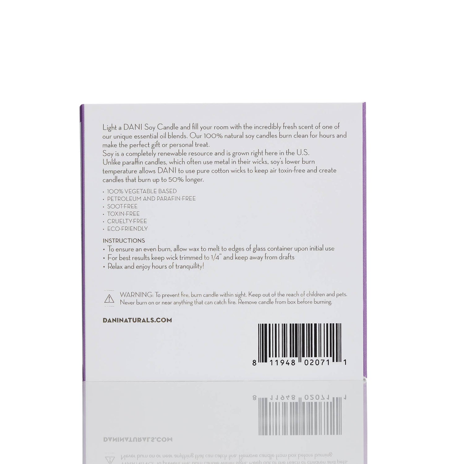 DANI Naturals Soy Candle is made with 100% non-GMO, pure soy wax and organic cotton wick scented with custom essential oil blends. It burns 50% longer & at lower temperature than paraffin; cleans easily with soap and water. Perfect gift or personal treat, offering a natural & indulgent sensory experience!
