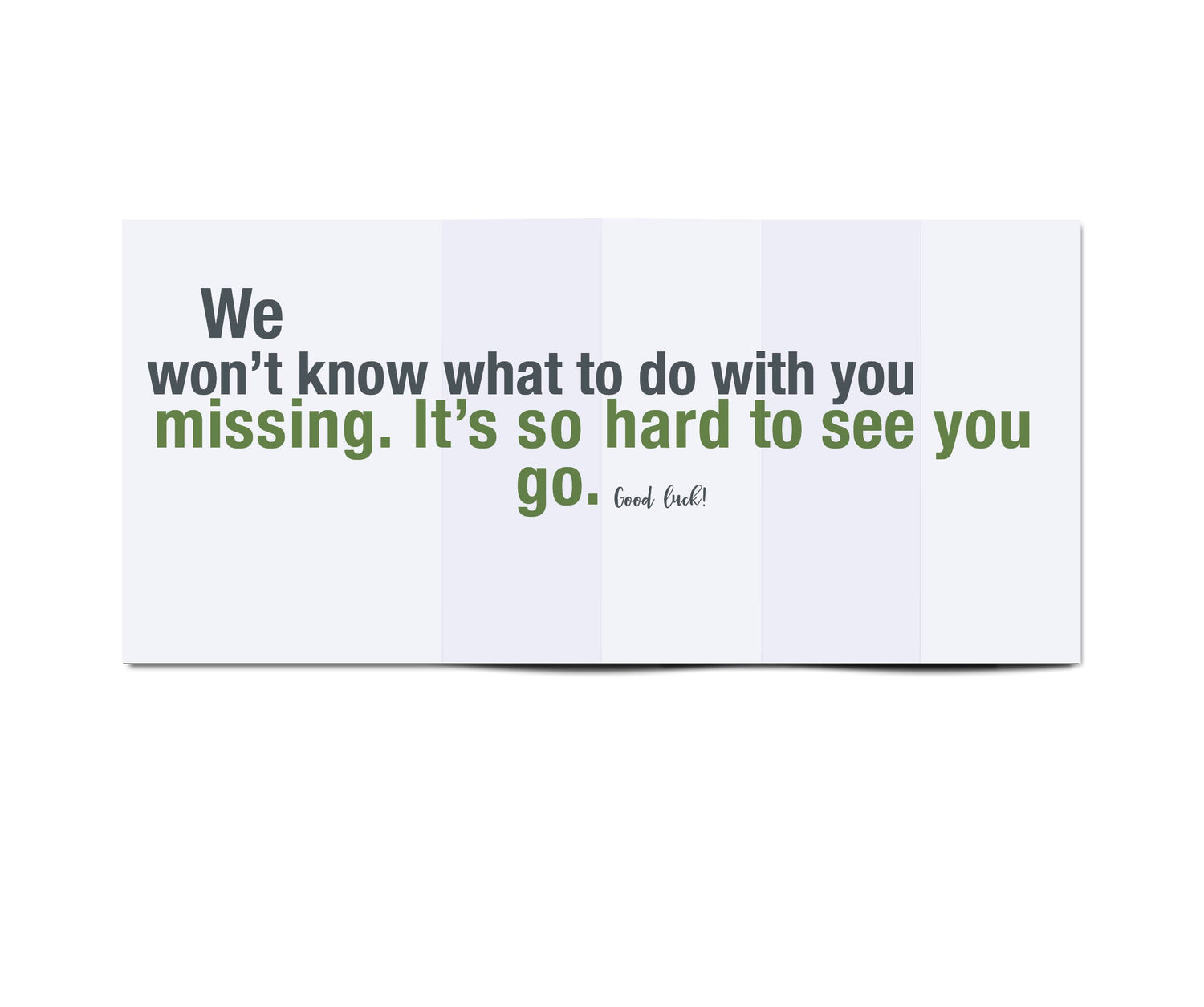 • A6 sized (4.5" x 6.25") when closed. The right-side accordion fold opens to reveal a surprising message (open size is 13.5" x 6.25").