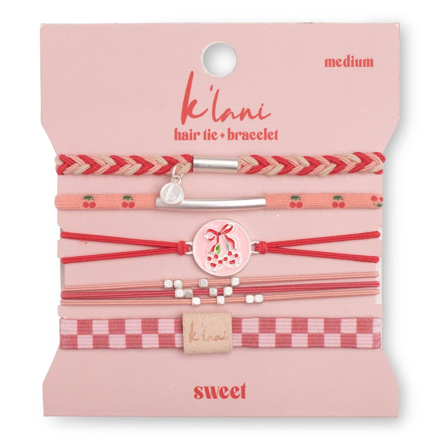 Our Sweet set includes 5 hair tie bracelets in fun coral, reds, and pinks. A touch of sweetness comes with the cherry charm and cute print. This set will surely remind us of fun and sweet summer days.