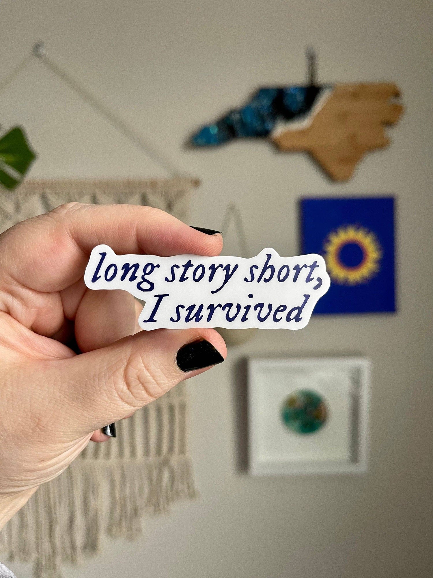 This "long story short, I survived" sticker is inspired by the TS song “Long Story Short” and features the lyrics in a navy blue folklore/evermore style font. The sticker is made from waterproof and weatherproof vinyl.