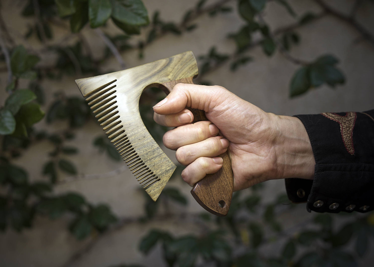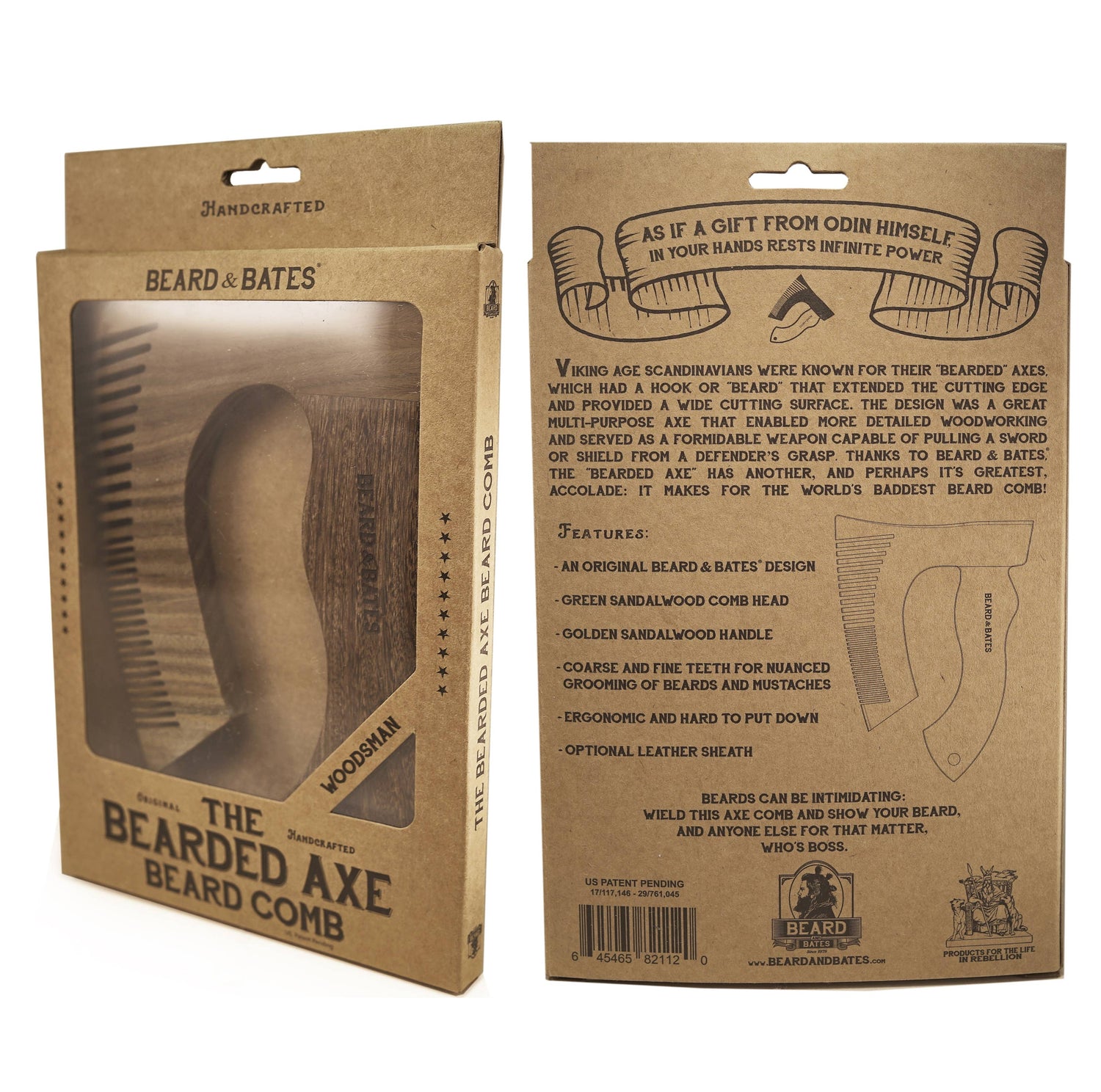An original and Patented Beard & Bates design, "The Bearded Axe Beard Comb" Woodsman is unlike anything else. It's partly ridiculous, partly over-the-top, but it's 100% a functional statement and each comb is a beautiful work of art. Expertly cut and assembled seamlessly from fragrant Green Sandalwood and Golden Sandalwood, the Original comb is refined and polished to perfection.