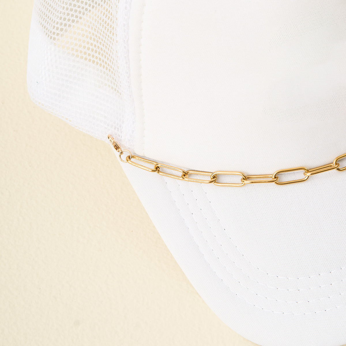 Introducing the newest accessory for hat lovers: the new Trucker Hat Chain! This versatile accessory effortlessly elevates your favorite hats. Crafted to fit seamlessly onto standard trucker hats, it features double-ended lobster clasps for easy attachment to the hat's mesh backing– simply snap on and go! Personalize your unique style effortlessly with chic gold and silver metallic chains, or dainty pearls.